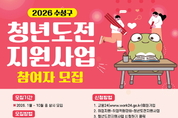 [시사뉴스 이성동 기자] 대구 수성구(구청장 김대권)는 구직에 어려움을 겪는 청년을 대상으로 2026년도 ‘청년도전 지원사업’ 참여자 130명을 모집한다고 밝혔다. 이번 사업은 18세부터 39세까지의 구직 단념 청년, 보호종료아동, 청소년쉼터 입·퇴소 청년, 북한이탈 청년, 가습기살균 피해 청년, 지역특화 청년 등을 대상으로 한다. 참여 청년에게는 맞춤형 상담과 사례 관리, 자신감 회복, 진로탐색, 취업 역량강화 등 단계별 프로그램을 제공한다. 참가자들은 직무 탐색, 취업 준비, 창업 기초, 지역 연계 체험 등 실무 및 진로 역량강화를 위한 교육을 받게 되며, 프로그램 이수 시 참여 수당과 이수·취업 인센티브가 지급된다. 특히 단기(5주), 중기(15주), 장기(25주) 과정별로 맞춤형 지원이 제공되며, 중기 과정은 20명, 장기 과정은 17명을 우선 접수한다. 사업 참여 및 신청 방법 등 자세한 사항은 수성구청년센터 누리집(https://www.suseongyouth.or.kr), 고용24, 수성구 청년도전지원사업 카카오채널(https://pf.kakao.com/_baxkfG)을 통해 확인할 수 있다. 김대권 수성구청장은 “이번 사업을 통해 구직 단념 청년