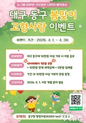 [시사뉴스 이성동 기자] 대구 동구청은 고향사랑기부제 활성화를 위해 4월 한 달간 ‘봄맞이 고향사랑 이벤트’를 진행한다. ○ 고향사랑e음 사이트를 통해 대구 동구에 10만원 이상 기부하면 자동으로 응모가 되며, 참여자 전원에게 네이버페이 1만원권을 지급한다. ○ 이와 함께 기본적인 혜택으로 기부 금액의 30% 한도 내에서 포인트가 제공되며, 해당 포인트를 사용하여 고향사랑e음 답례품몰에서 다양한 지역 특산품을 구매할 수 있다. ○ 한편, 기부금 10만원까지는 전액 세액공제가 적용되고, 10만원 초과 20만원 이하는 44%, 20만원을 넘는 금액에 대해서는 16.5%의 세액 공제를 받을 수 있다. ○ 김태운 동구청장 권한대행은 “고향사랑기부제는 지역 발전에 동참하면서도 기부자에게 실질적인 혜택이 돌아가는 뜻깊은 제도다. 이번 이벤트를 통해 동구와 특별한 인연을 맺는 기회가 되길 기대한다.”고 말했다.